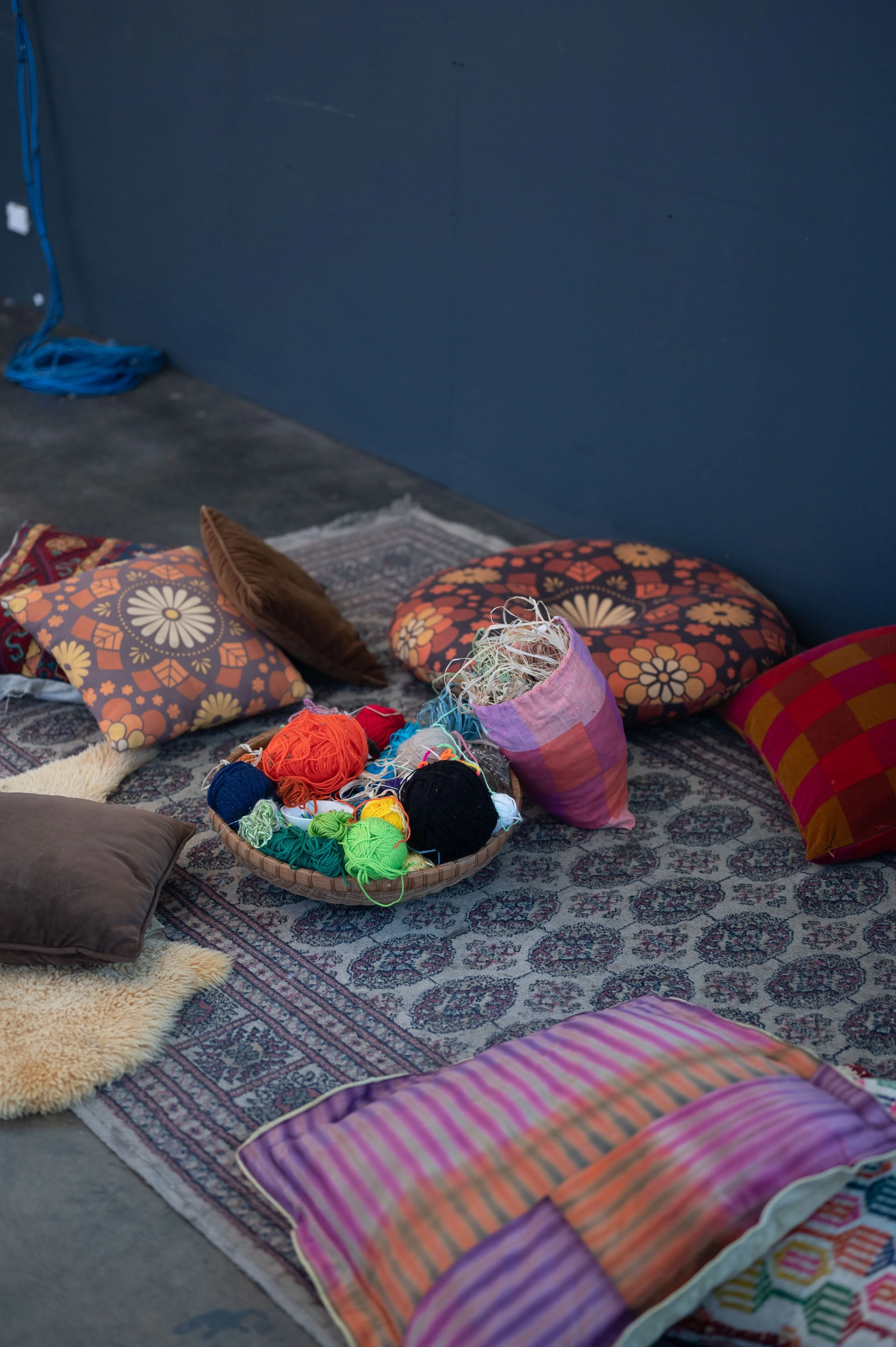For Woven Together, Marisa Taylor, founder of Mycelium Parents, hosted a series of workshops, teaching the ancient art of weaving to parents as they shared heartfelt stories and tended to little children. The parents each made small spiral weavings, some individually, some were picked up and worked on by multiple mamas. Marisa then wove these little pieces together to form the large piece, symbolizing how we come together with our different backgrounds finding ways to mingle, connect and form new shared histories. Woven Together is thus a statement on relearning lost crafts and finding moments of connection in the disjointed modern world to heal the deep losses felt from the fallout of years of parenting from the nuclear model. Together, we imagine, envision and weave together the threads of a new shared culture based on care, compassion and deeply valuing our roles in this season of nurturing little people. Woven Together will continue to grow as more people join the village and contribute their unique weave.